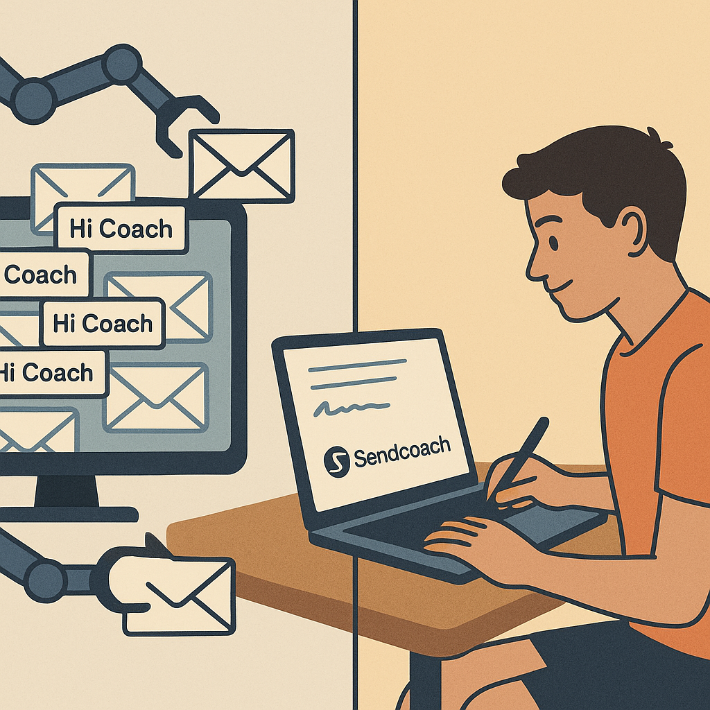 Why Sendcoach avoids one-click mass emails—because real recruiting success comes from personalized, one-to-one connections, not automated blasts.